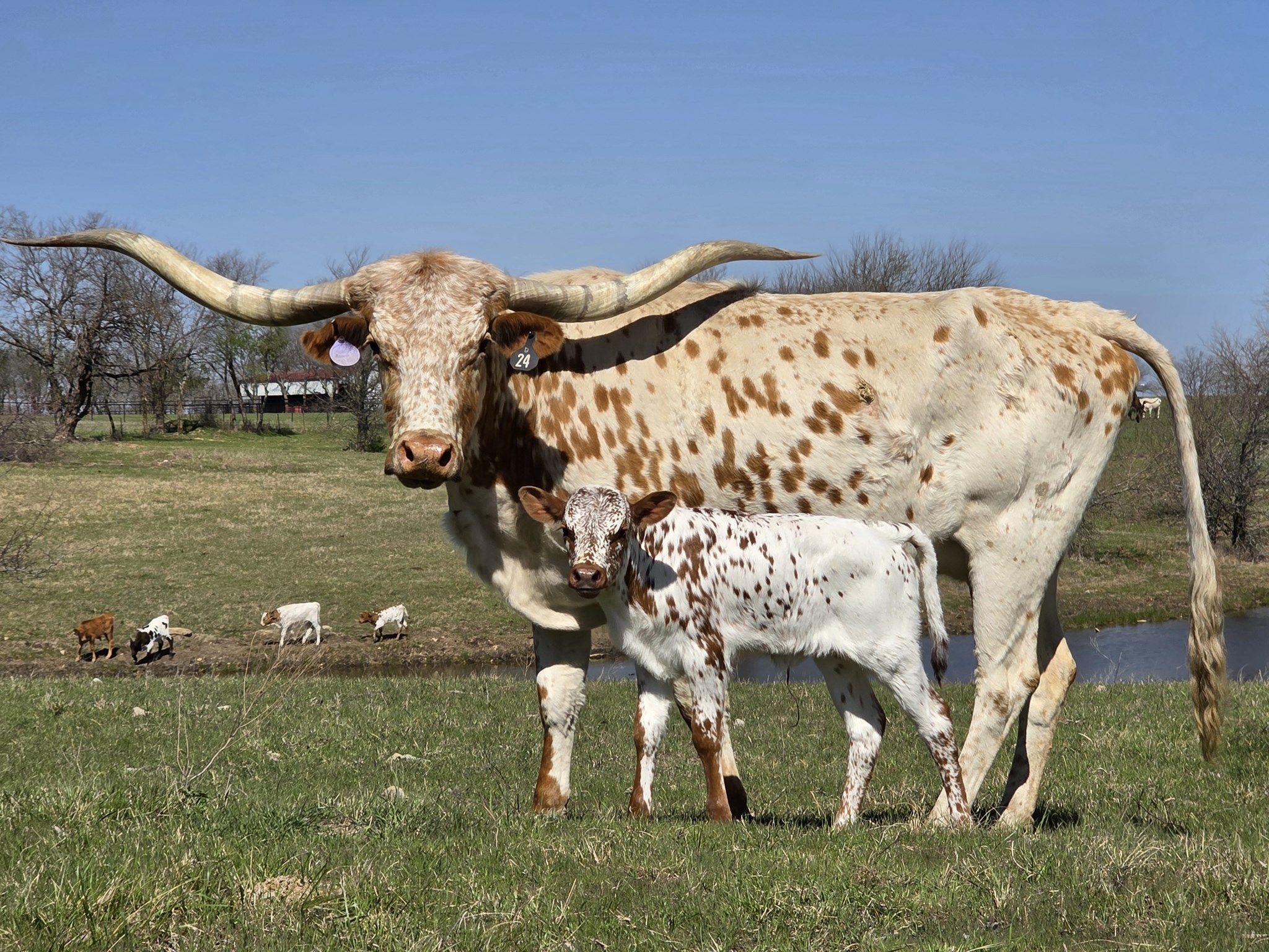 Meet RJF Chillingo, she has a distinctive coat of white and brown speckles, giving her a rugged yet elegant appearance. Chillingo’s most impressive feature is her long, gracefully curved horns that extend outward, a hallmark of the breed. With a strong, well-proportioned build, she exudes both power and grace.