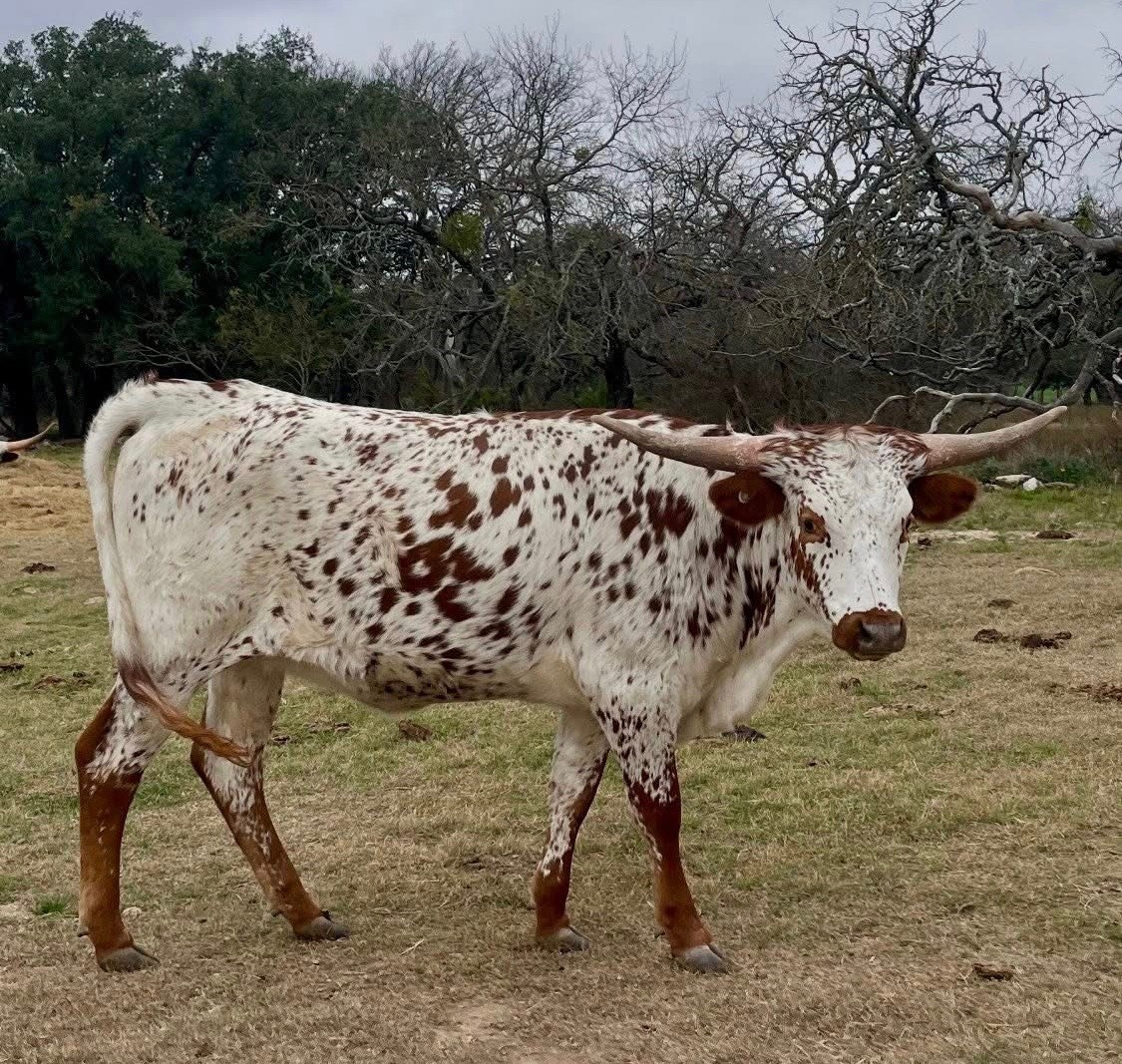 Her mother is still just 4 yrs old but I'm really starting to think she is going to be a very powerful foundation cow for us. Her mother, Night Watch SRC, had a heifer named Night Walk that was born the year before in 2020 that sold for $15,000 in 2024 at the Legends. The Bentwood ranch owns her now and she is 92" as a 5 yr old. Night Walk's 2025 heifer sired by RJF Black Magic looks super flashy and is now in the possession of McEntire Farms. Her sire is also RJF Black Magic. Her sister out of her mother from 2023 named Watch Me Jama is probably one of our best built animals on our farm with great horn as well. This heifer is all spotted up and one of the prettiest faces you'll find anywhere with an incredible backward horn set with awesome hooks. She measured 33.75" on her first birthday even with the backward horn. She's built correct with good length and depth. It's hard to find one like this with the complete package. We have her consigned to the 2026 Texas Treasure Sale. Probably wouldn't have consigned her if we didn't have her sister here and we're retaining her mother as well.